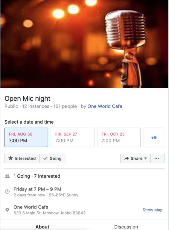 Do you have a special talent that you want to share or have an interest in open mic entertainment? One World Cafe is hosting an open mic night Friday from 7-9 p.m. All ages are welcome to this all-inclusive event. Performers sign up at 6:30 p.m. and each set are around 10 minutes long. But One World will be open until 10 p.m. for extra wiggle room, in case of lots of performers. This is a perfect way to spend a Friday night and is a great way to support the talented people of Moscow.