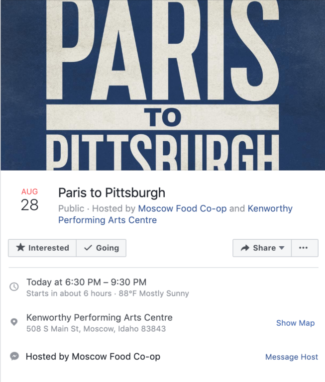 Six times every year the Moscow Food Co-op and the Kenworthy Performing Arts Centre come together for one night. And tonight is one those nights! From 7-8:30 p.m. the Kenworthy will be showing the film ‘Paris to Pittsburgh’ as part of their Food for Thought series. Doors open at 6:30 p.m. If you have interest in learning about how people are responding to the threat of climate change then grab a friend, a reusable straw and head over to the Kenworthy tonight for a movie and a few snacks!