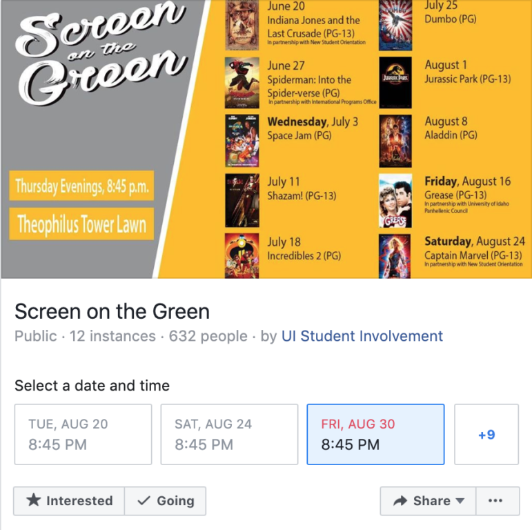 The University of Idaho is having its very own movie night on the Tower Lawn. This will be the last Screen on the Green event, so mark your calendars! The movie is “The Hustle,” PG-13. The event will be from 8:45-11 p.m. It isn’t just for students of the University, everyone from the Palouse is welcome to enjoy a night on the green! The movie is best experienced if you bring blankets, bug spray and snacks.