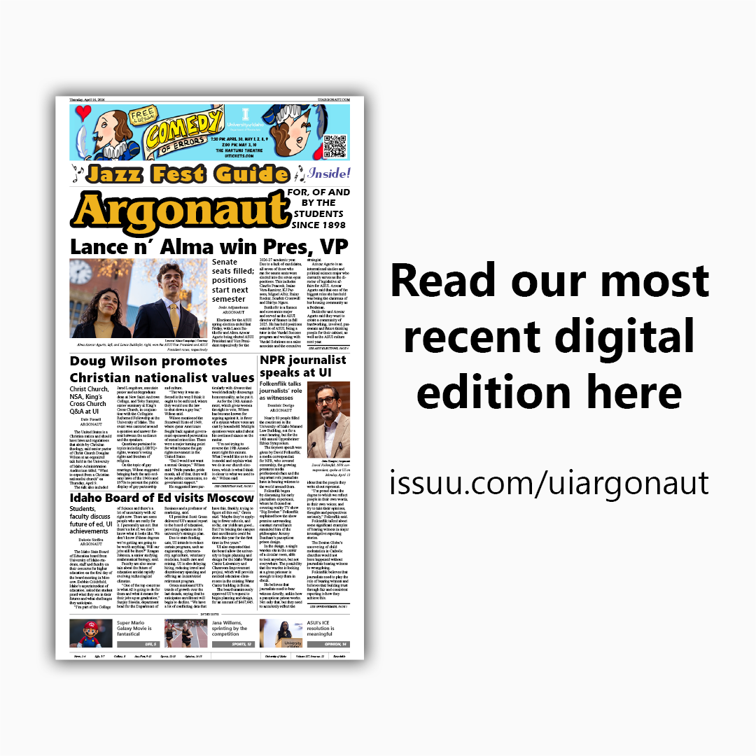 Indivisible Moscow to host “Citizens’ Forum and Social” Idaho relays on the rise: The Vandals’ 4×100 dominance in 2026 Vandals battle through skid, secure Big Sky tournament berth with late push Jayden’s Arena: High world cup tickets threaten to ruin tournament for many across the world Jayden’s Arena: USMNT has questions to answer before the World Cup this summer NewsIndivisible Moscow to host “Citizens’ Forum and Social” “Lance n’ Alma” win Pres. and VP in ASUI spring election Nez Perce Drive closed to through traffic through September LifeCrumbs: Honey garlic chicken The SSC to host the fifth annual Earth JamKINO Film Festival returns for its 26th year SportsIdaho relays on the rise: The Vandals’ 4×100 dominance in 2026 Vandals battle through skid, secure Big Sky tournament berth with late push Jayden’s Arena: High world cup tickets threaten to ruin tournament for many across the world OpinionOPINION: ASUI’s ICE resolution is meaningful but symbolism alone isn’t enough OPINION: U.S. blockade of Iranian ports is a dangerous gamble that risks global stability OPINION: Idaho must embrace duplex housing to confront its growing affordability crisis Our ViewOur View: New Joe Vandal Statue doesn’t honor ASUI Our View: Many voters don’t realize the importance of city elections Our View: Death penalty doesn’t provide justice Our View: When silence becomes complicityOur View: Kirk’s murder again underscores senseless violence Our View: Was justice served? An impossible question Subscribe to our newsletter! By continuing, you accept the privacy policy