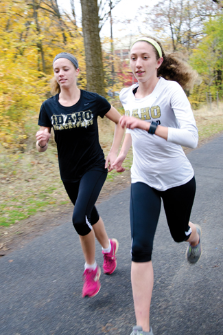 Cross country runner, freshman Halie Raudenbush, practices with teammate Alycia Butterworth Tuesday on Paridise Path.