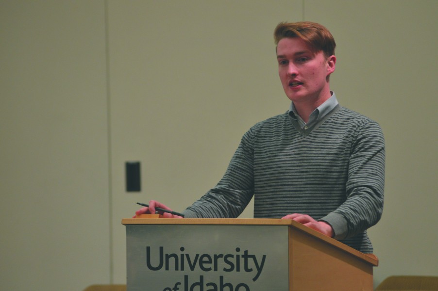 ASUI President Max Cowan addresses to the ASUI senate Dec. 9 on an open textbook program.