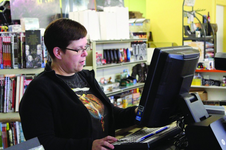 Tabitha Simmons works the register at the comic shop she co-owns with Kathy Sprague.