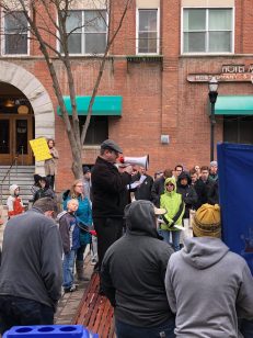 Pro-life advocates settled in and Pastor Jonathon Krenz stood atop a bench, looking out over the crowd. He spoke into a megaphone, booming biblical verses across the square.