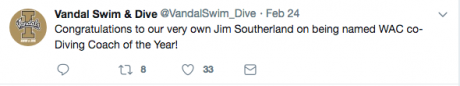 The Idaho swim and dive Twitter account tweeted a congratulatory note about Southerland’s coaching honor Feb. 24, six days after