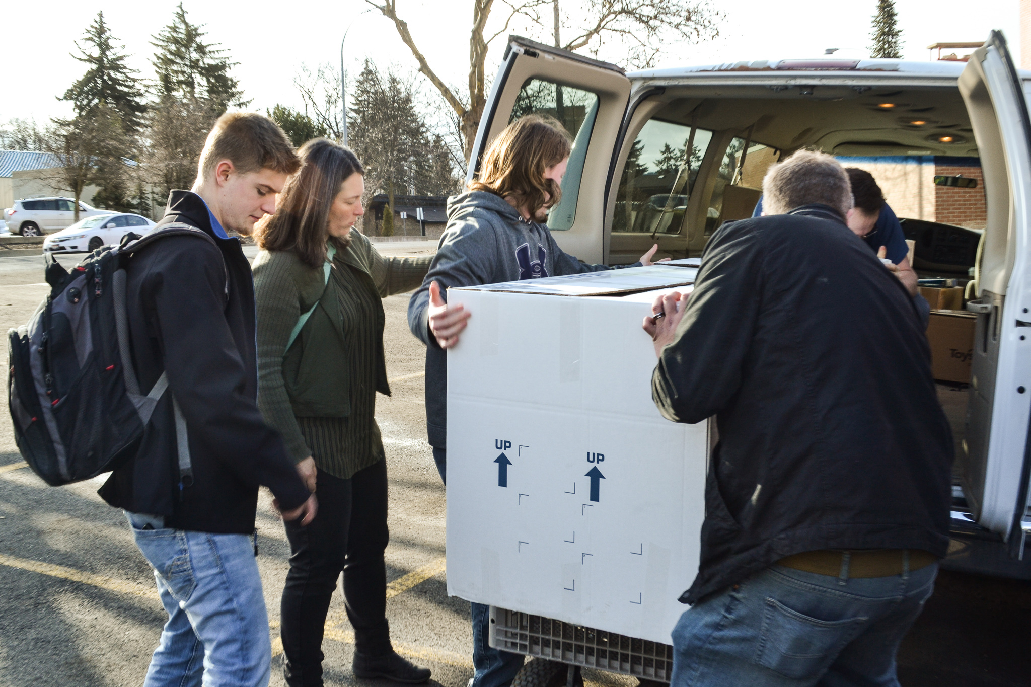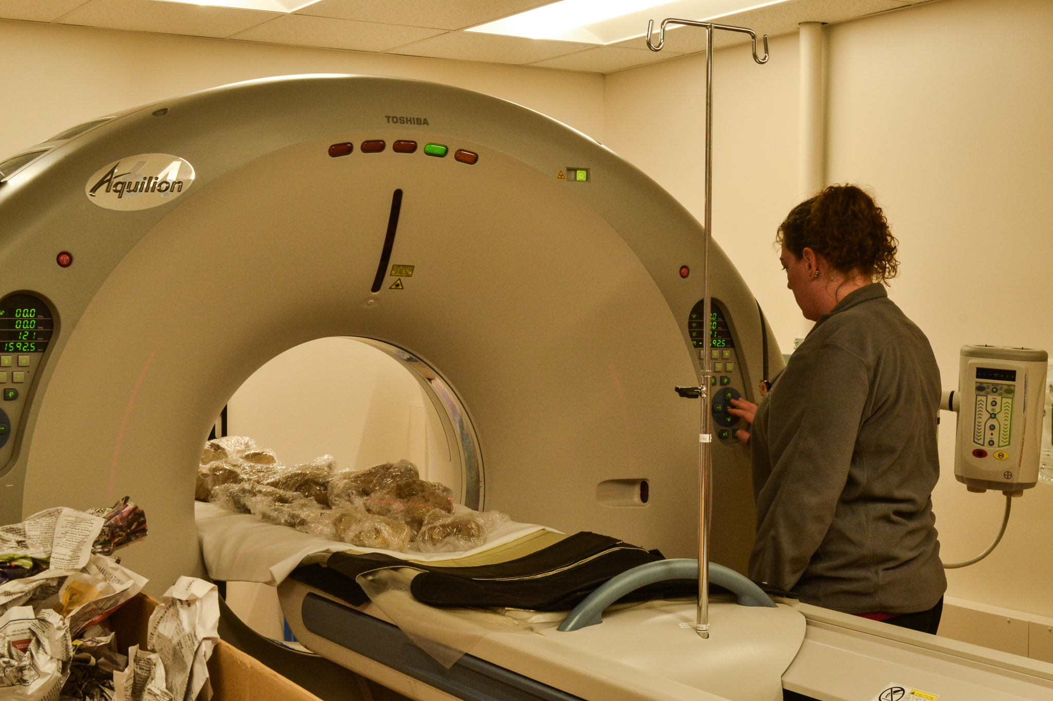 A large box is carried out of a van and into a wagon, which is then pulled through the physician’s entrance of Gritman Medical Center to a room with a large CT scanner. Inside the box are several pieces of cellophane wrapped mammoth bones.