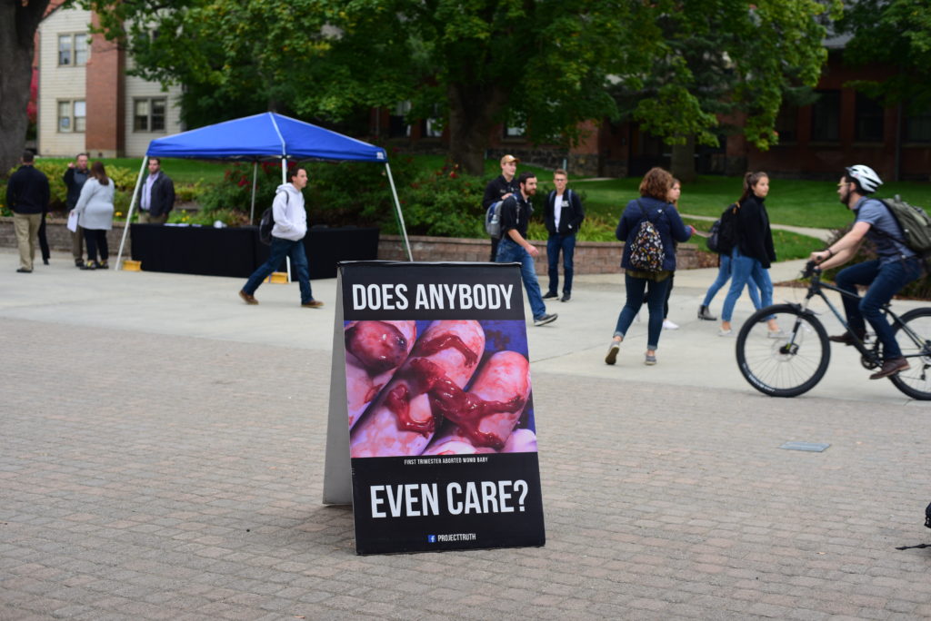 The demonstration, organized by the Center for Bio-Ethical Reform (CBR), featured signage depicting graphic images of seemingly aborted fetuses with captions such as “American Killing Fields” and “The Body Inside Your Body Is Not Your Body.”