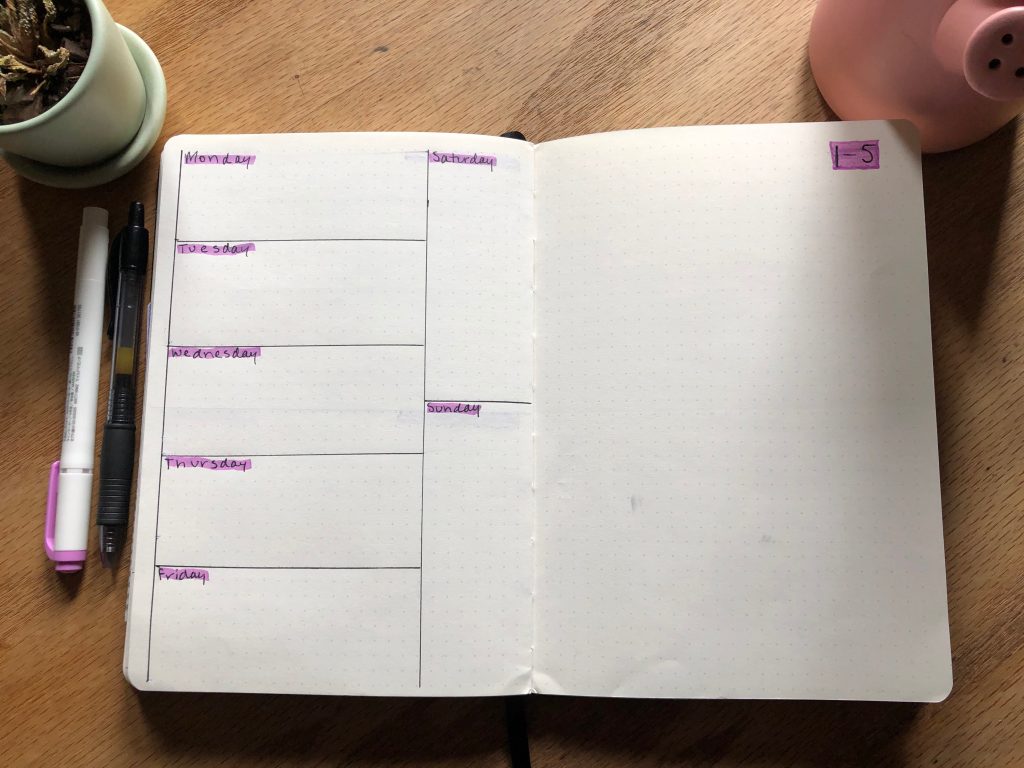 This is going to be the bulk of the monthly spread. This section changes the most based on how busy, creative and whatever each person needs. This is a simple weekly spread that I do which works well while balancing being a busy student and working a full-time job where every week looks different. Each week will be two pages.