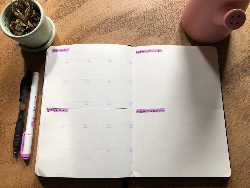 On these two pages, I split notes and events on one page and reminders and quotes on the other. The dimensions for each box is 20 boxes high and 26 boxes wide, splitting the two pages into four sections.