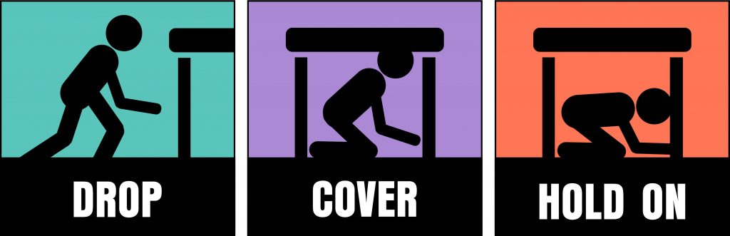 - Drop: If an earthquake is felt drop on your hands and knees, this protects you from falling over from the earthquake, but you can still move around.