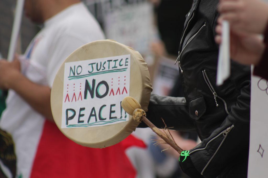 Many people at the protest wore masks to help prevent COVID-19 from spreading. The officers did not wear masks but kept their distance while watching the protest.