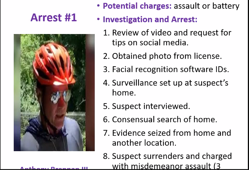 Sanders said law enforcement reviewed video of the behavior, asked for tips from social media, obtained Brennan’s photo from his driver’s license, used facial recognition software and surveillance of the Brennan’s home, interviewed Brennan, consensually searched Brennan’s home and seized evidence before Brennan surrendered himself to the police.