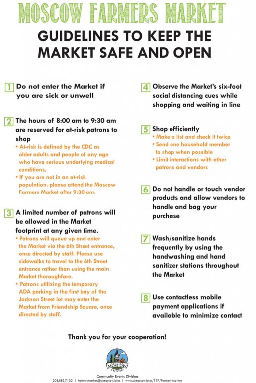 A short drive from Moscow to Pullman will give shoppers the satisfaction of browsing homegrown produce and other homemade items. The market has requested guests follow these rules: no more than 10 patrons, are allowed at a time on the lawn, no food may be consumed on site no sampling items, maintain social distancing of at least six feet between vendors and patrons, wear a mask and send one person to the shops when possible.