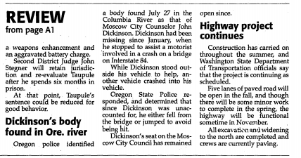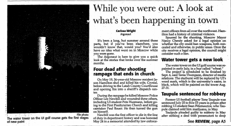 The Argonaut provided a quick look at what happened in Moscow while students were away during the summer of 2007. Some events were on the happier side, such as the new paint job on the water tower, while others were devastating for the city, such as the local shooting. It was important students were made aware of what happened – both the good and the bad.