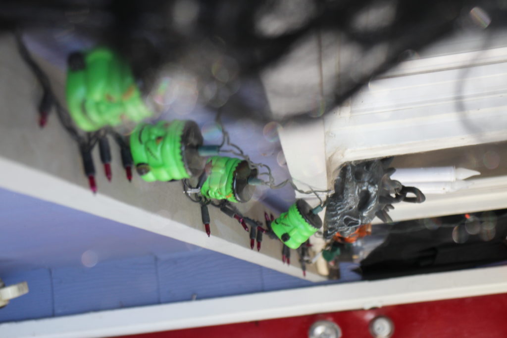 A skeleton taped to the bright red front door holds a sign reminding visitors to wash their hands when they enter. Spider webs, skulls and Halloween-themed tinsel also join the themed lights to create a truly spooky entrance.