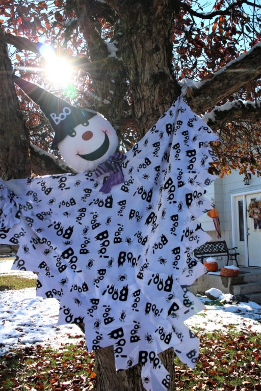 Pumpkins, a scarecrow and a fall-themed wreath decorate the front door. A fabric ghost hangs from the tree nearby.