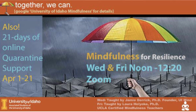 Drop into a state of mindfulness with Associate Professor and faculty at the University of Idaho, Jamie Derrick. Her weekly meditation practice will give people a place to relax and unwind for 20 easy minutes. The drop-in is open to all and no prior meditation experience is necessary to join.