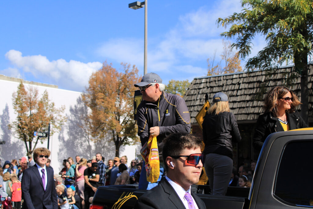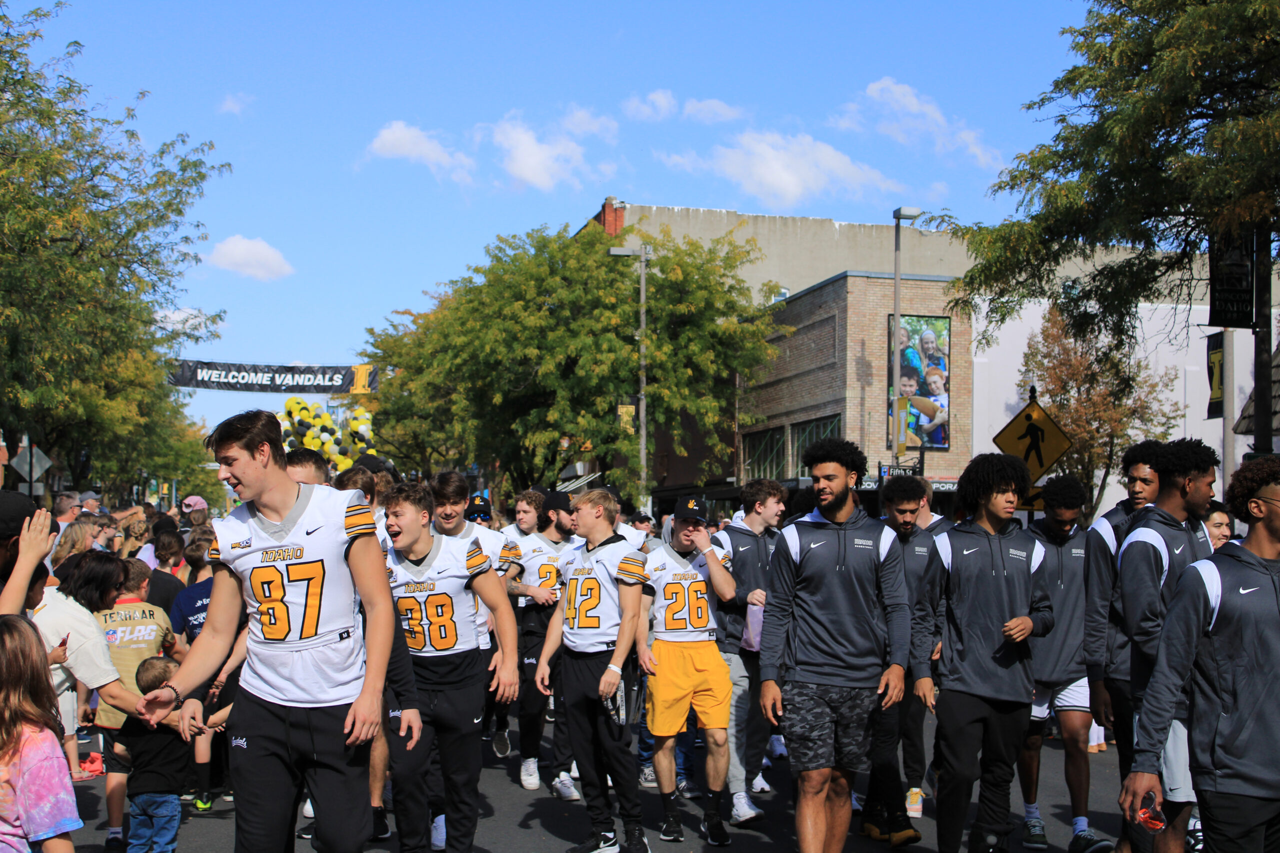 The Border Highlanders marching in the homecoming day parade | Connor Anderson | ArgonautThe Vandals marching band at the start of the homecoming day parade | Connor Anderson | ArgonautThe Vandals football team marching together with other sports in the parade | Connor Anderson | ArgonautPresident Scott Green throwing candy to members of the crowd | Connor Anderson | Argonaut