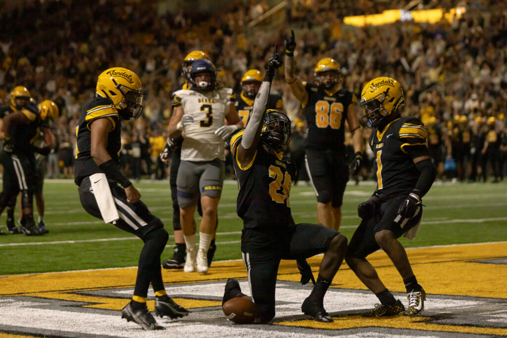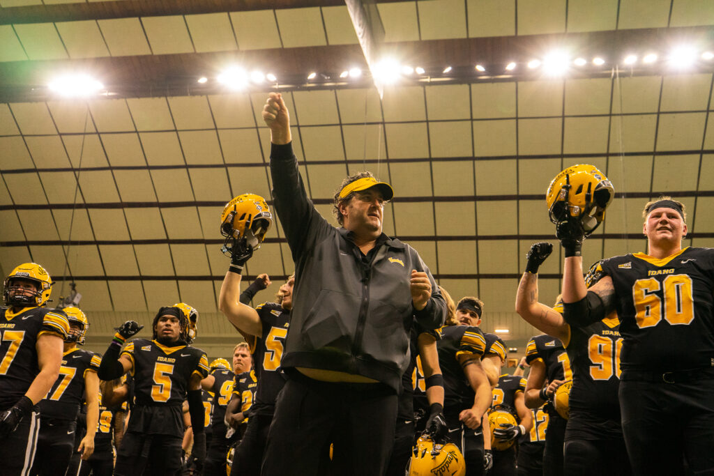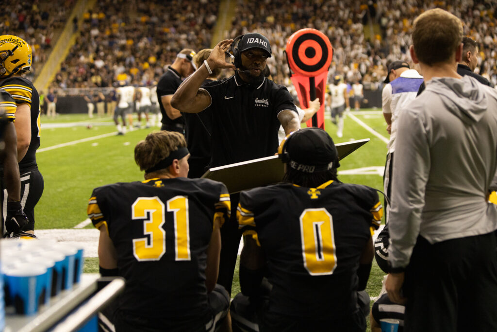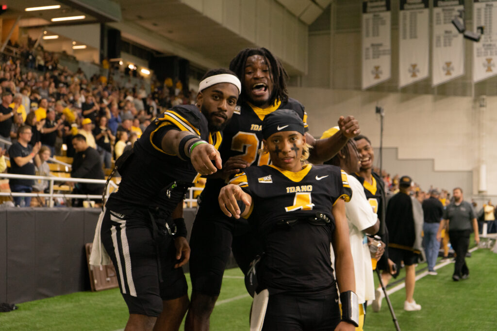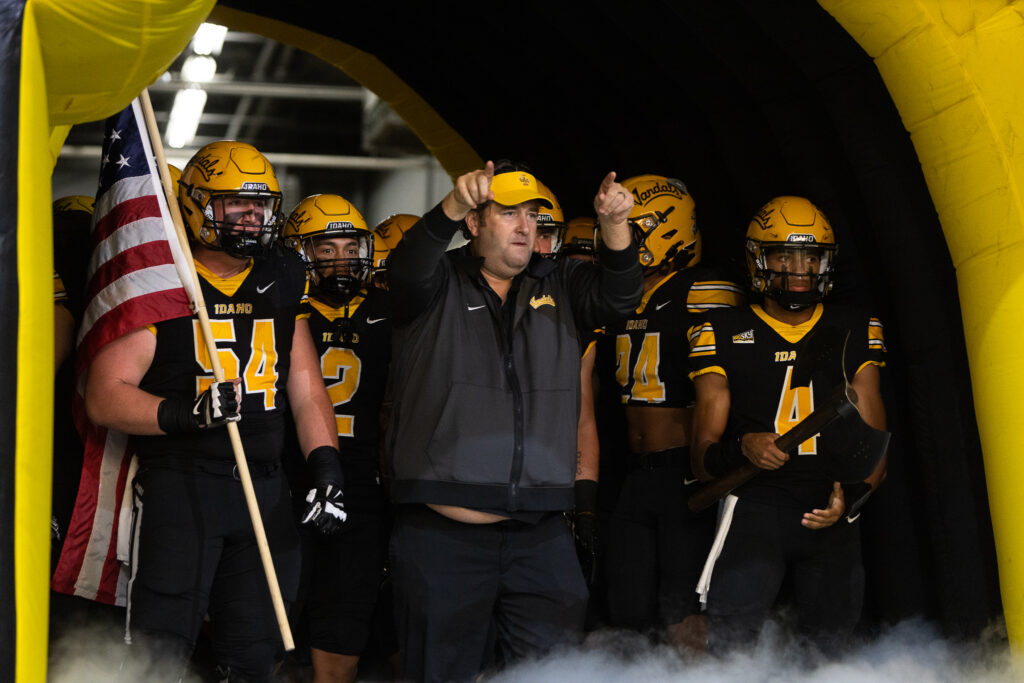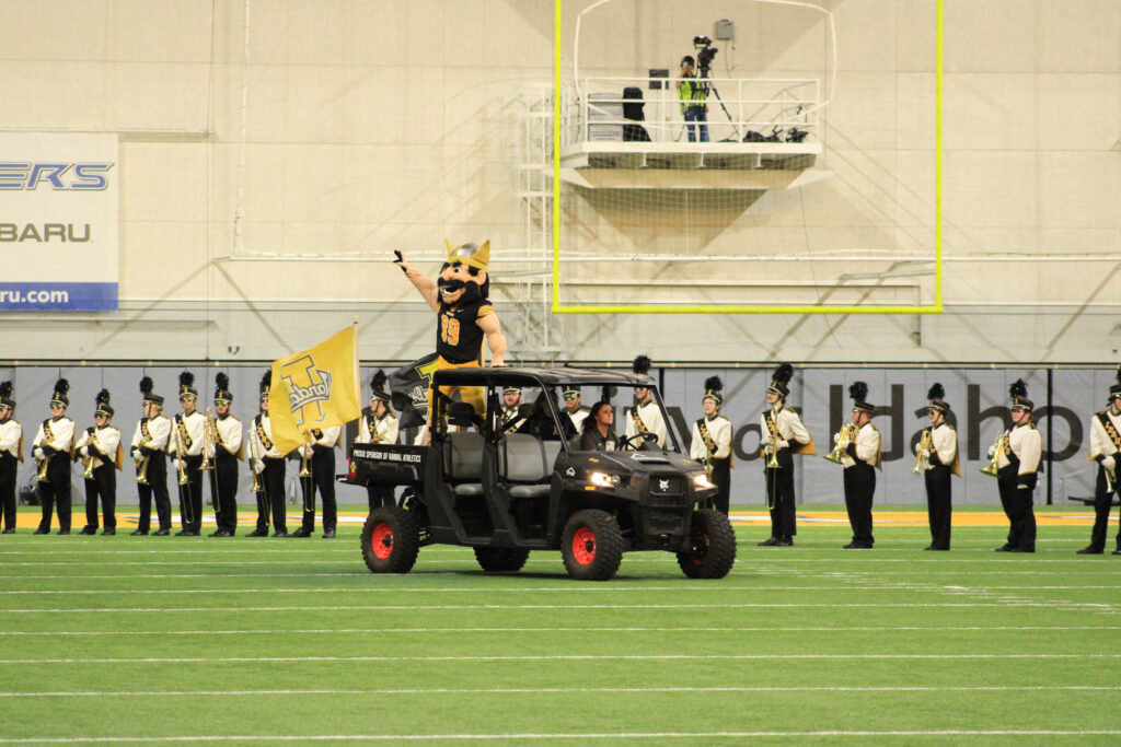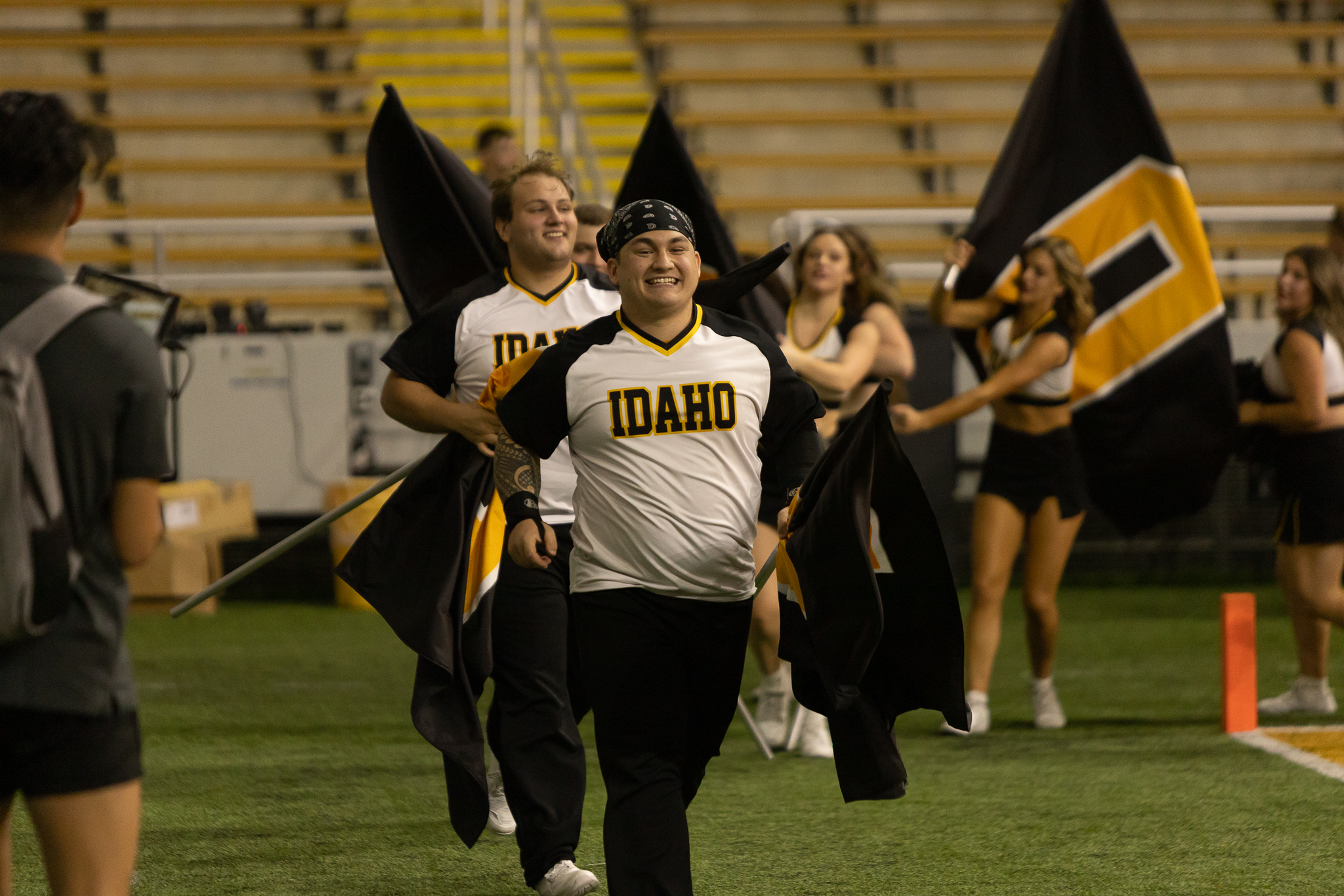 Coach Jason Eck leading the Vandals into the Kibbie Dome | Daniel V. Ramirez | ArgonautJoe Vandal riding out before the game to get fans excited | Connor Anderson | ArgonautJunior kicker Ricardo Chavez kicking for an extra point | Connor Anderson | ArgonautUI students holding clappers and watching the homecoming game | Daniel V. Ramirez | ArgonautUI students cheering during the homecoming game | Daniel V. Ramirez | ArgonautStanley Franks Jr. coaching both Mathias Bertram and Murvin Kenion III | Daniel V. Ramirez | ArgonautAnthony Woods celebrating in the Endzone | Daniel V. Ramirez | ArgonautIssac Sanchez smiling after running in the endzone in celebration of a touchdown | Daniel V. Ramirez | ArgonautMolly Collins running back from celebrating in the endzone | Daniel V. Ramirez | ArgonautMembers of the Vandal football team posing for a picture | Daniel V. Ramirez | ArgonautCoach Jason Eck and the Vandal football team chanting the school song after winning the homecoming game | Daniel V. Ramirez | Argonaut