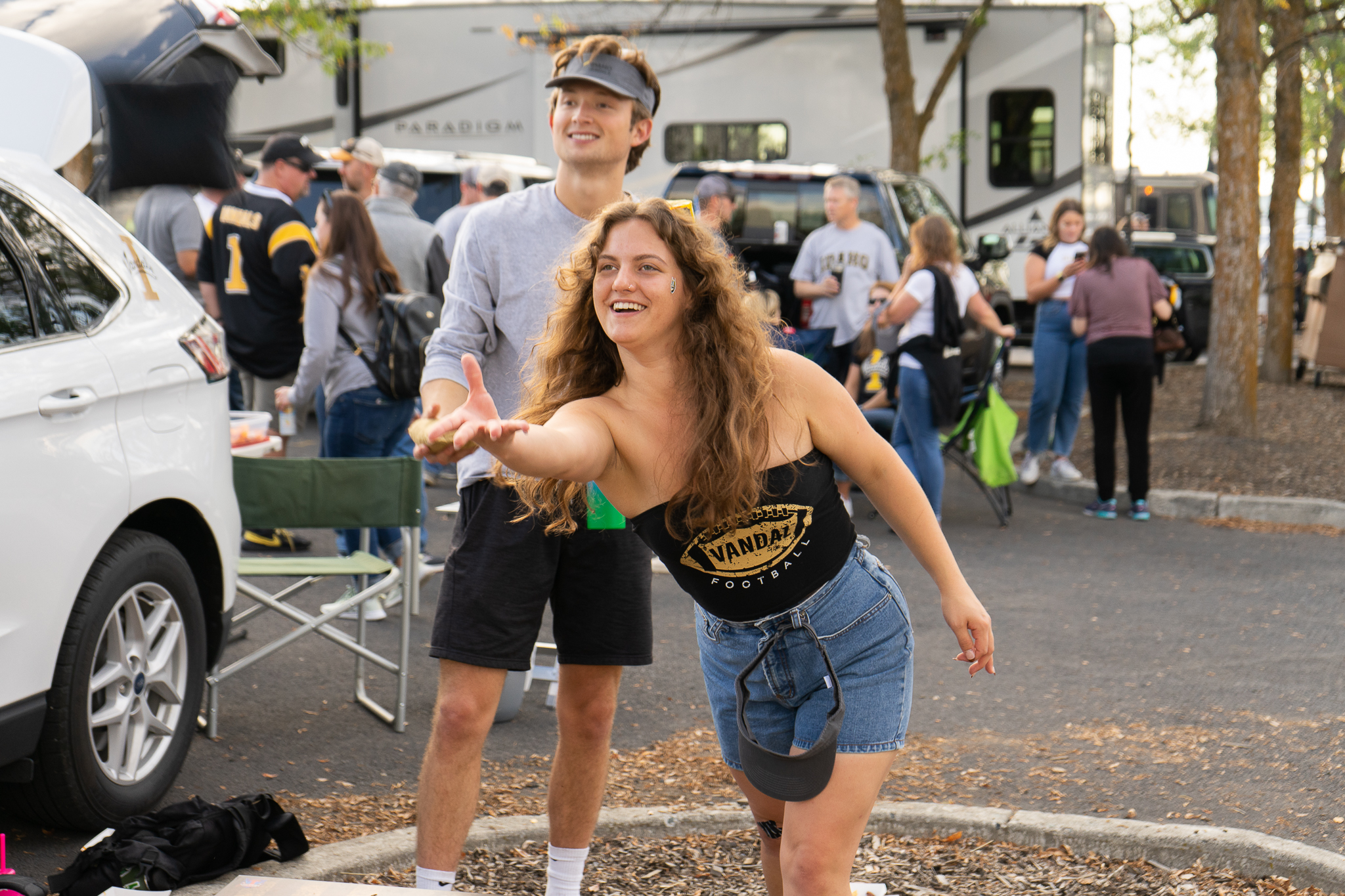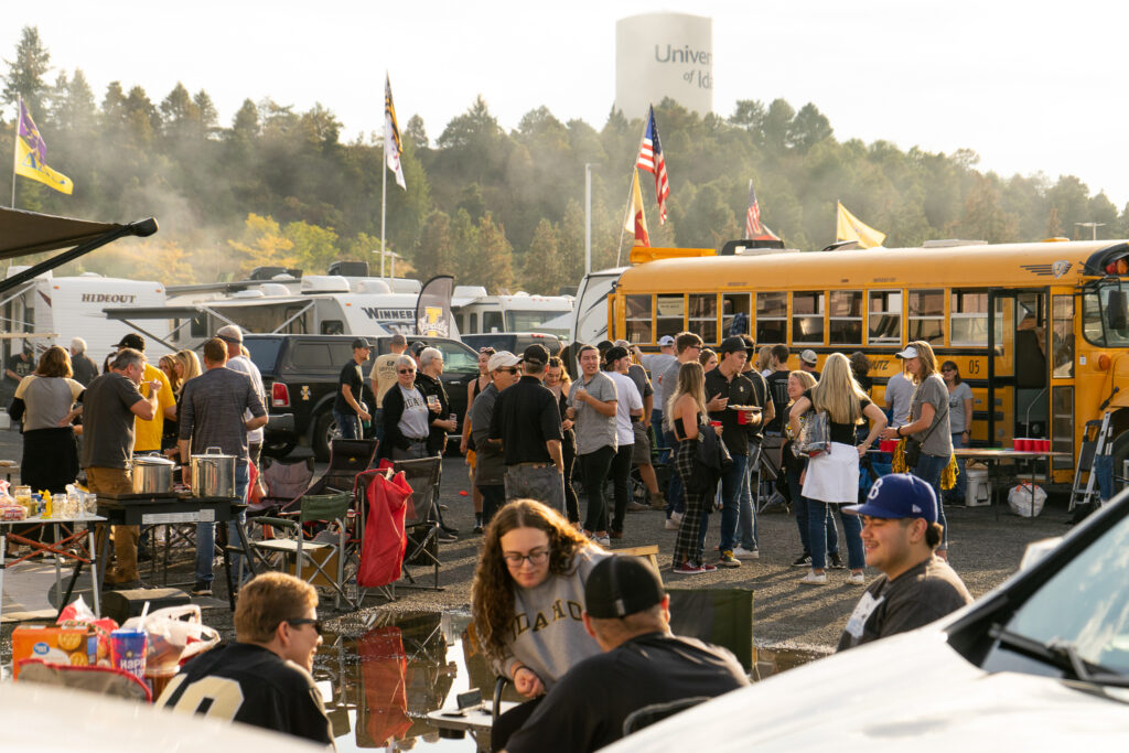 Alumni and students at the tailgate | Daniel V. Ramirez | ArgonuatAlumni watching Colby Acuff at the Tailgate | Daniel V. Ramirez | ArgonautUI students playing cornhole | Daniel V. Ramirez | ArgonautAlumni tailgaiting at the Kibbie Dome parking lot | Daniel V. Ramirez | ArgonautUI students posing for a picture at the tailgate | Daniel V. Ramirez | ArgonautUI students eating before the game starts | Daniel V. Ramirez | ArgonautThe Vandals marching band performing out front of the stadium before the game starts | Connor Anderson | Argonaut
