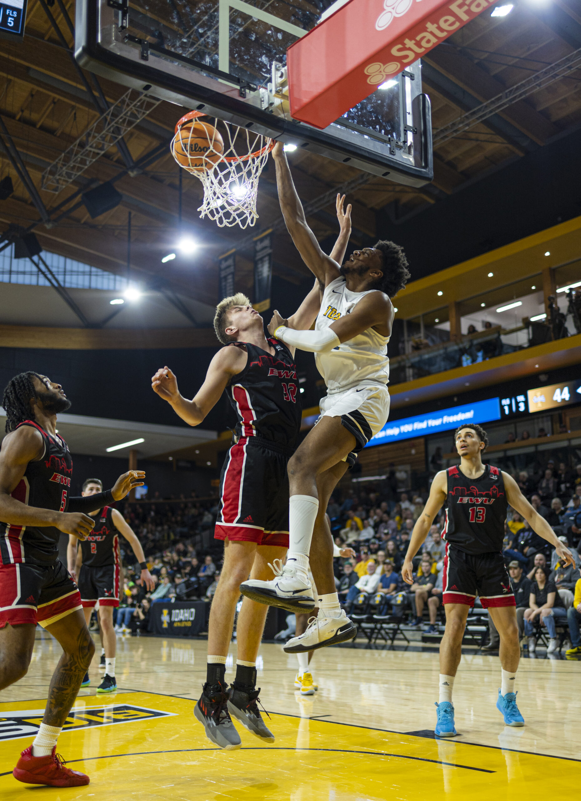 The second half began all Eagles as they went on a 7-0 run to make it 37-30. The Vandals would outscore the Eagles 9-3 and get the lead down to 40-39. The game would once again go back and forth, Jones got the ball in the paint and slammed down a reverse dunk over 6-foot-10, 240-pound Erikstrup to get 3,300 fans to their feet as the Vandals pushed their lead to 46-42.