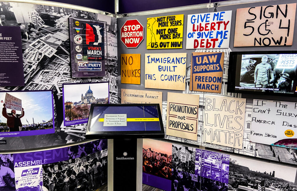 “Voices and Votes” focuses on the history of voting in America. It covers the grievances that led to the American Revolution and the efforts of various groups to gain the right to vote under the established American government. Additionally, the exhibit includes sections on voter disenfranchisement, the technology used to count votes and the history of political party symbols.