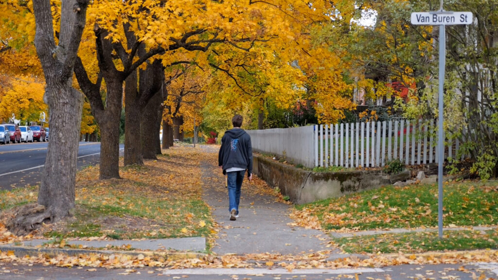 A student walks down Hello Walk surrounded by twisting branches and changing leaves | Reagan Jones | Argonaut