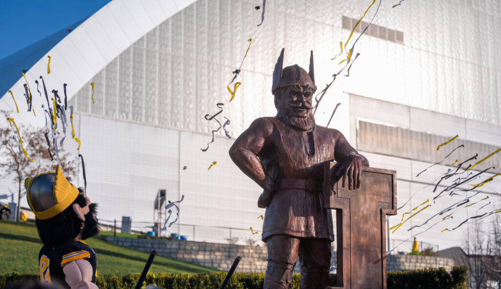 A bronze Joe Vandal statue, located outside of the ICCU Arena and Kibbie Dome, was unveiled in the afternoon of Saturday, Nov. 8.