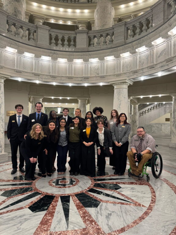 The group of students and ASUI members traveled to Boise for the 2026 ASUI Legislative Ambassador trip, an annual opportunity for students to learn about the state’s legislative process firsthand and promote UI interests.