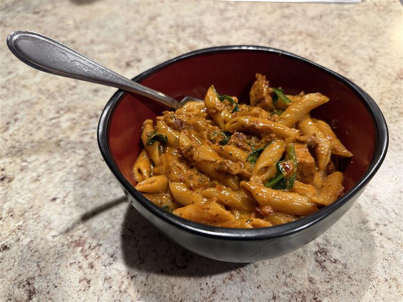 - Once combined, add in the pasta noodles and serve with chicken.