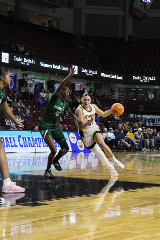 The Idaho Central Arena grew quiet as junior guard Hope Hassmann stepped to the free throw line for a chance to seal the Idaho Vandals’ (28-5, 17-1) 59-51 semifinal victory over Sacramento State (15-18, 8-10). Hassmann took some deep breaths, dribbled the ball twice and swished both free throws, capping the Vandals’ victory over the Hornets. Hassmann led the Vandals with 15 points, three rebounds and three assists.